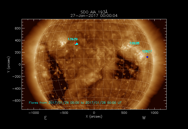 The most recent flares (≤12 hours) are shown as red dots, 12-24 hours ago as blue dots and older ones as turquoise dots.