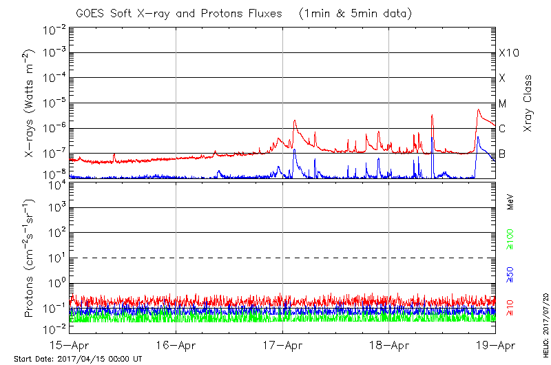 This page provides light-curves generated from GOES soft X-ray and Particle data for the date indicated at the top and the preceding three days.