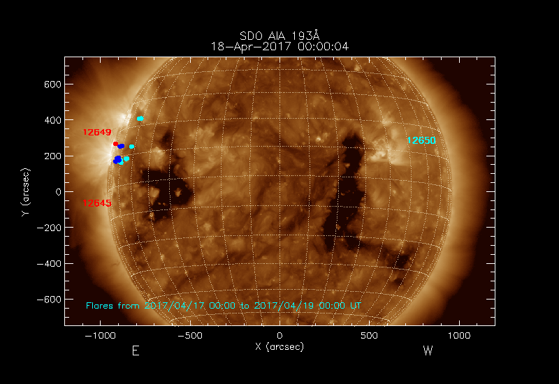 The most recent flares (≤12 hours) are shown as red dots, 12-24 hours ago as blue dots and older ones as turquoise dots.