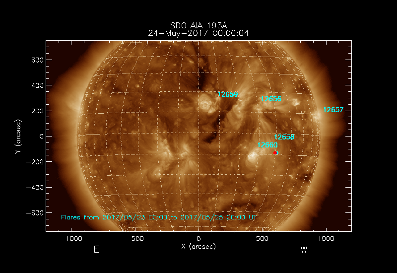 Click on an Active Region plot to display the Region Report including the region evolution and flaring history. HEC Search for NOAA Active Regions (SRS) records for this date and the day before.