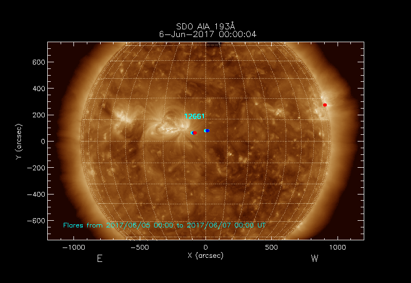 The most recent flares (≤12 hours) are shown as red dots, 12-24 hours ago as blue dots and older ones as turquoise dots.