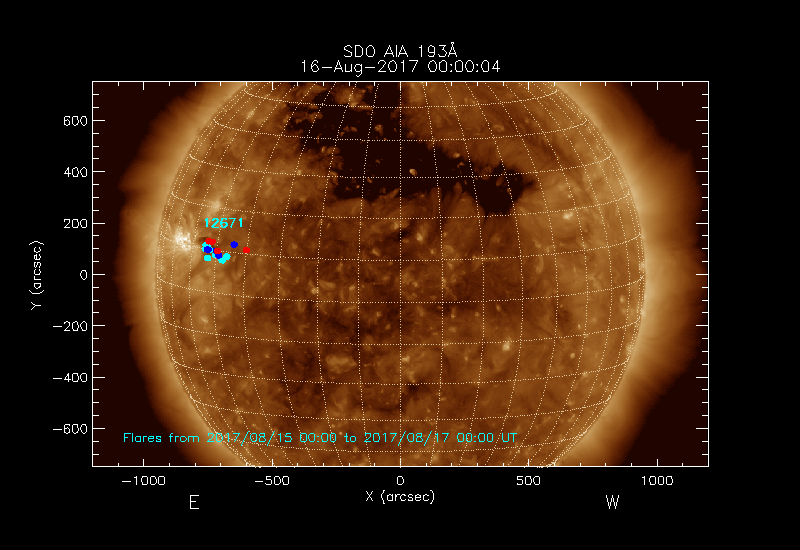 The most recent flares (≤12 hours) are shown as red dots, 12-24 hours as blue