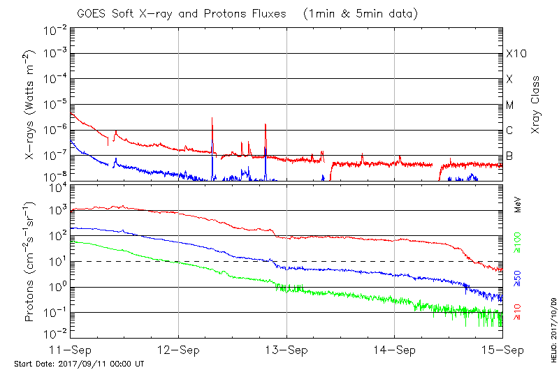 This page provides light-curves generated from GOES soft X-ray and Particle data for the date indicated at the top and the preceding three days.