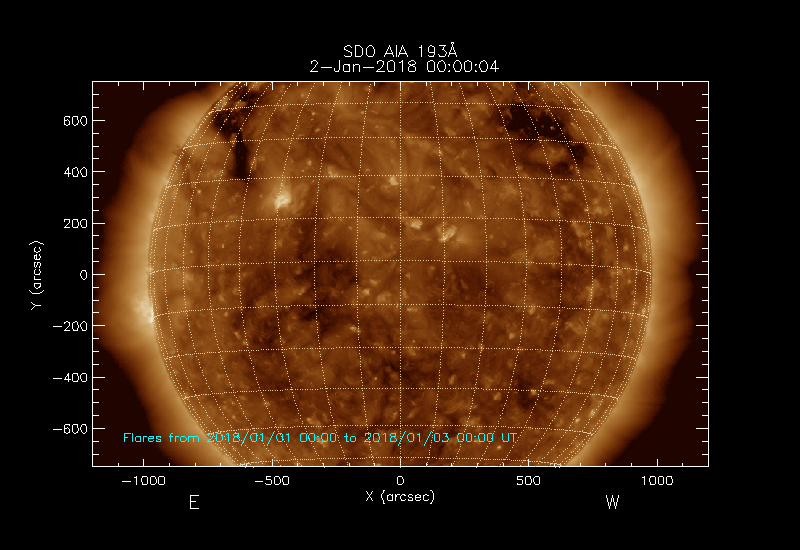 The locations of the flares over-plotted on the image are derived from the flare catalogue