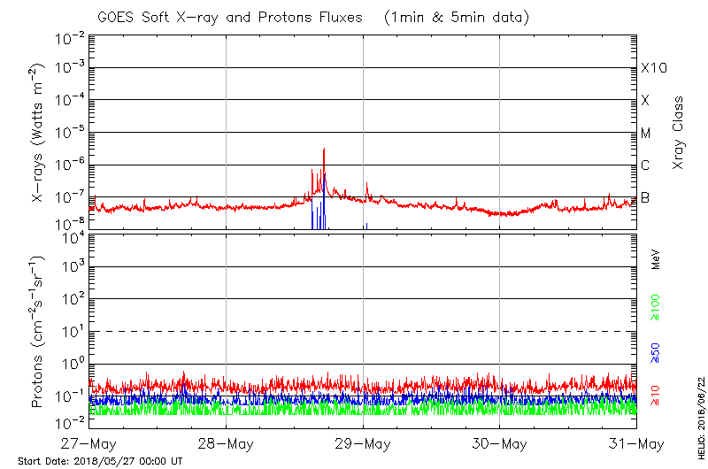This page provides light-curves generated from GOES soft X-ray and Particle data for the date indicated at the top and the preceding three days.