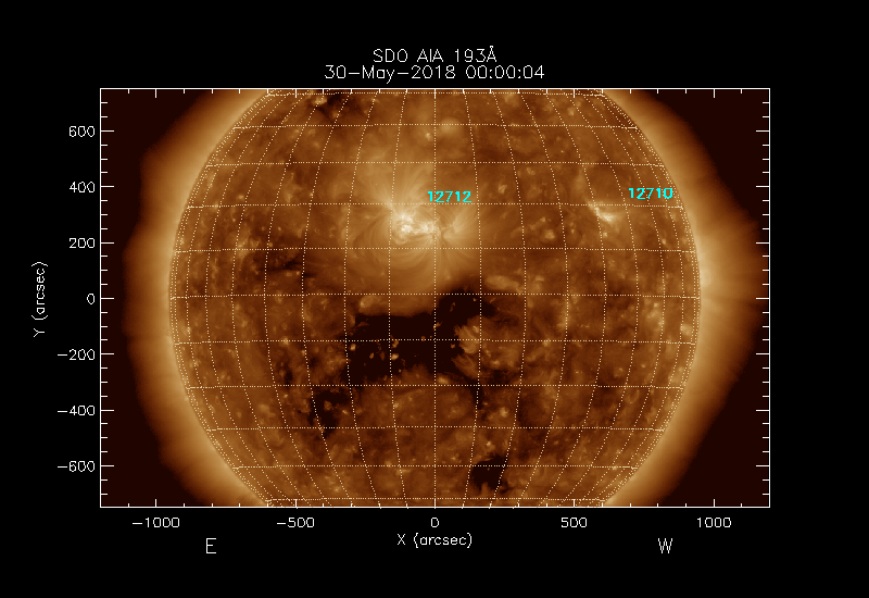 Click on an Active Region plot to display the Region Report including the region evolution and flaring history. HEC Search for NOAA Active Regions (SRS) records for this date and the day before.