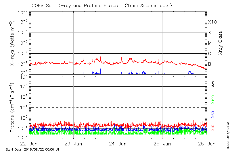 This page provides light-curves generated from GOES soft X-ray and Particle data for the date indicated at the top and the preceding three days. The designated date is the right most panel; the locations shown on the Flare Locations page are covered in the two right hand panels.