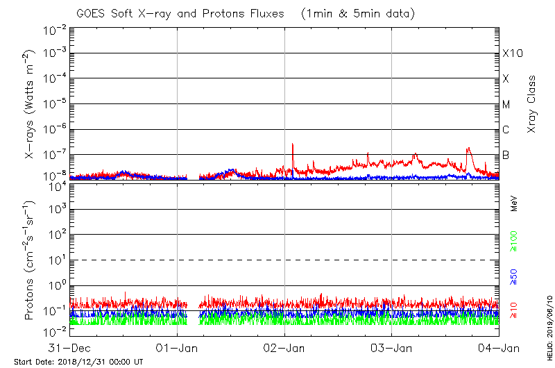This page provides light-curves generated from GOES soft X-ray and Particle data for the date indicated at the top and the preceding three days.