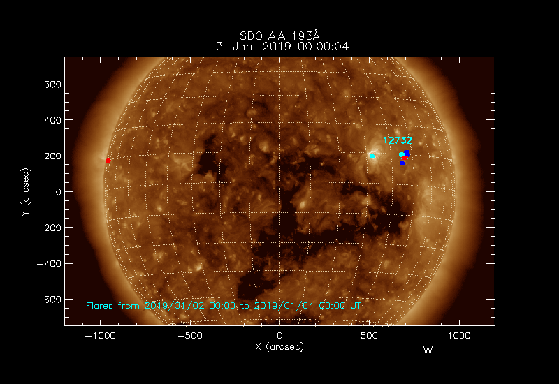 The most recent flares (≤12 hours) are shown as red dots, 12-24 hours ago as blue dots and older ones as turquoise dots.