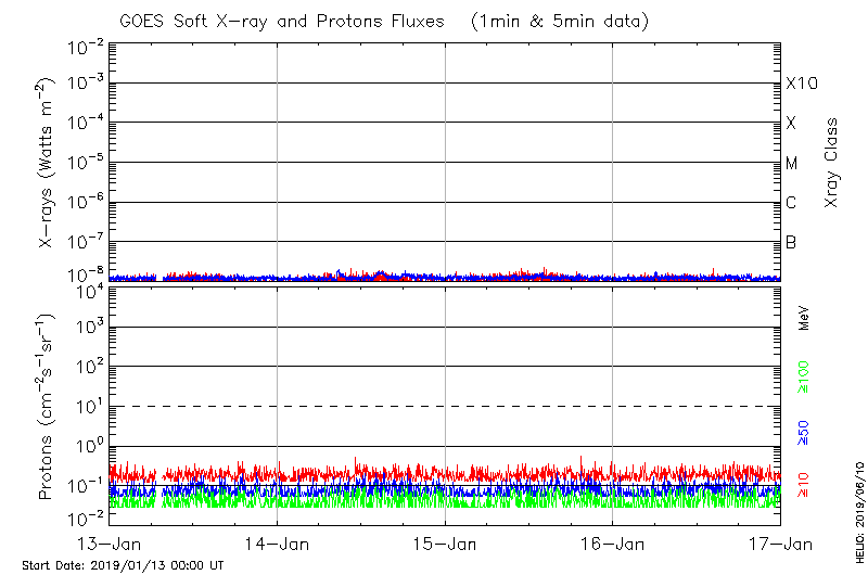 This page provides light-curves generated from GOES soft X-ray and Particle data for the date indicated at the top and the preceding three days.