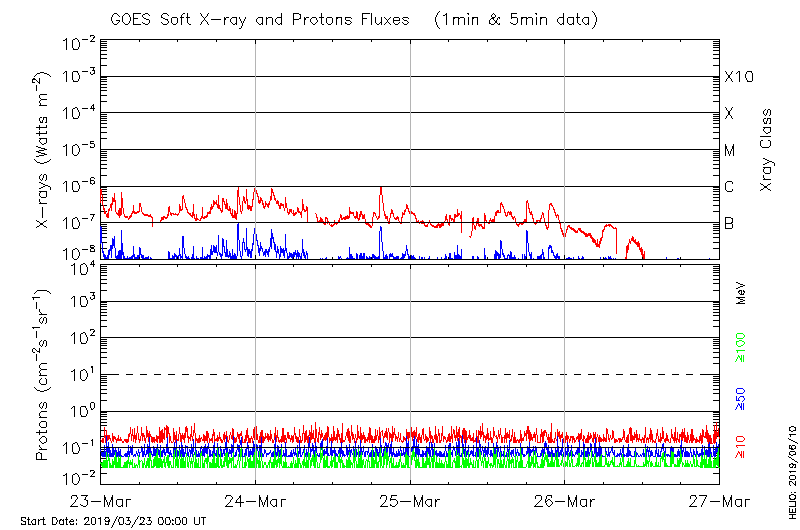 This page provides light-curves generated from GOES soft X-ray and Particle data for the date indicated at the top and the preceding three days.