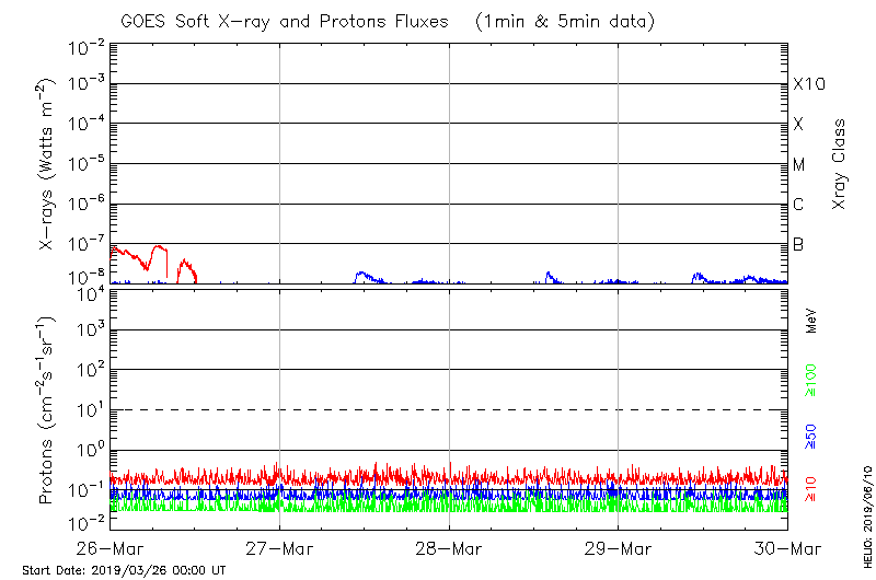 This page provides light-curves generated from GOES soft X-ray and Particle data for the date indicated at the top and the preceding three days.