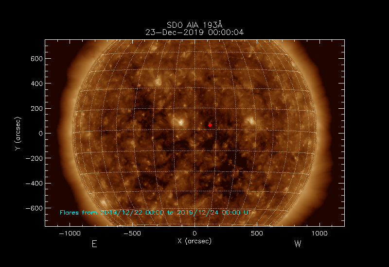The most recent flares (≤12 hours) are shown as red dots, 12-24 hours ago as blue dots and older ones as turquoise dots.