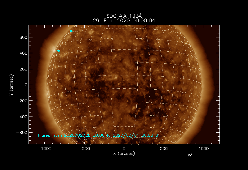 The locations of the flares over-plotted on the image are derived from the flare catalogue