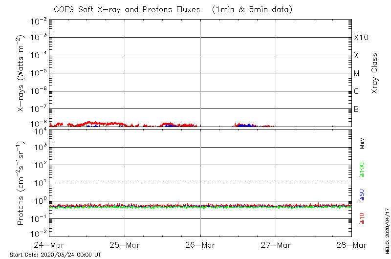 This page provides light-curves generated from GOES soft X-ray and Particle data for the date indicated at the top and the preceding three days.
