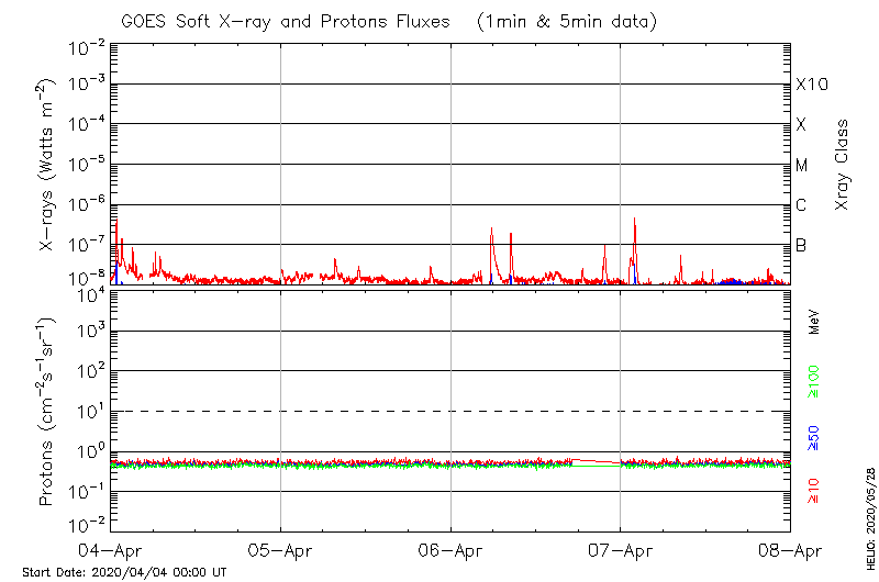 This page provides light-curves generated from GOES soft X-ray and Particle data for the date indicated at the top and the preceding three days.