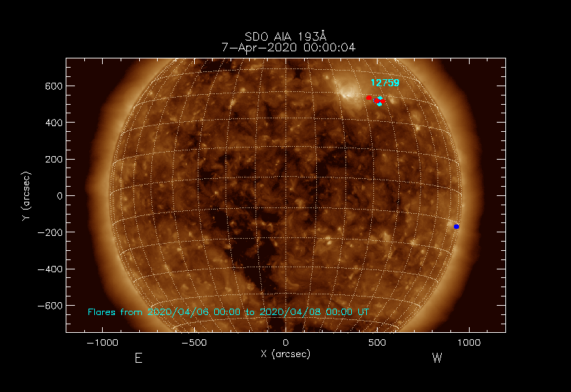 The most recent flares (≤12 hours) are shown as red dots, 12-24 hours ago as blue dots and older ones as turquoise dots.