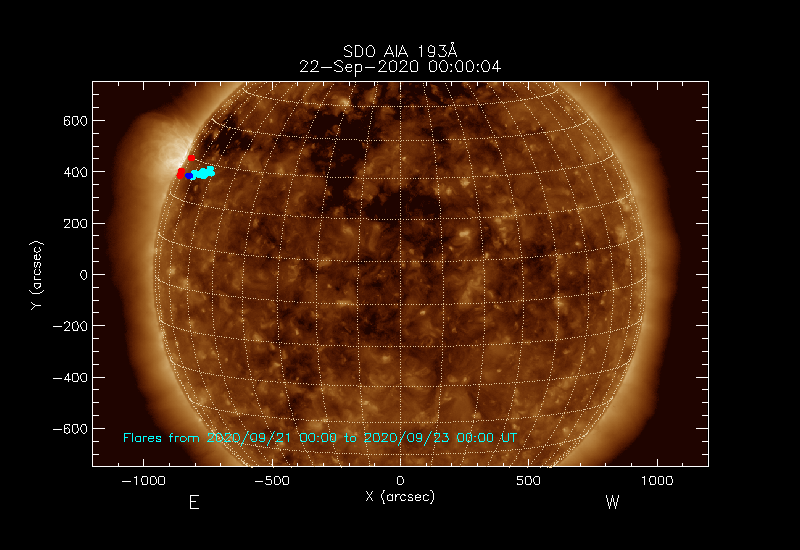 The most recent flares (≤12 hours) are shown as red dots, 12-24 hours ago as blue dots and older ones as turquoise dots.