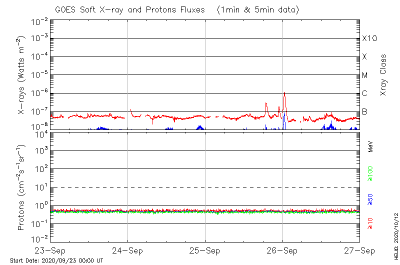 This page provides light-curves generated from GOES soft X-ray and Particle data for the date indicated at the top and the preceding three days. The designated date is the right most panel; the locations shown on the Flare Locations page are covered in the two right hand panels.