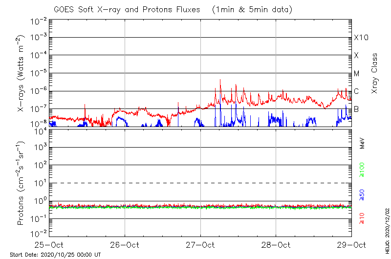 This page provides light-curves generated from GOES soft X-ray and Particle data for the date indicated at the top and the preceding three days.