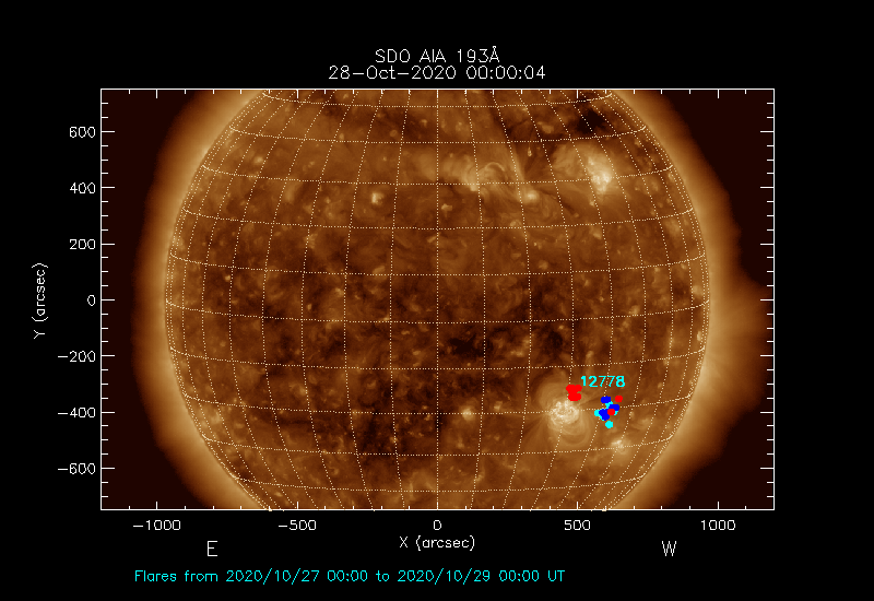 The most recent flares (≤12 hours) are shown as red dots, 12-24 hours ago as blue dots and older ones as turquoise dots.
