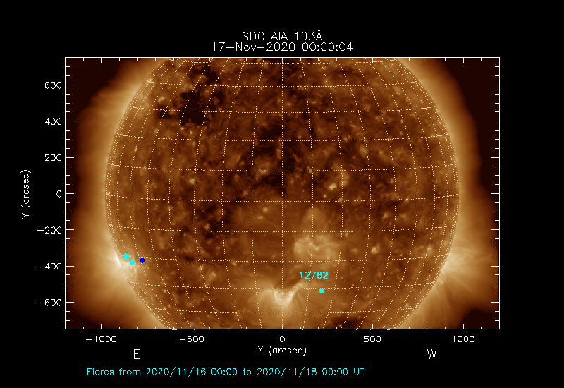The most recent flares (≤12 hours) are shown as red dots, 12-24 hours ago as blue dots and older ones as turquoise dots.