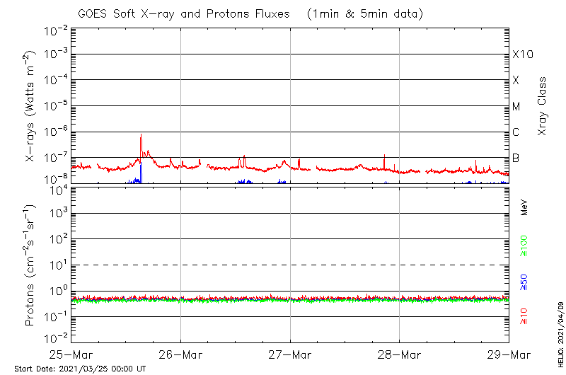 This page provides light-curves generated from GOES soft X-ray and Particle data for the date indicated at the top and the preceding three days.