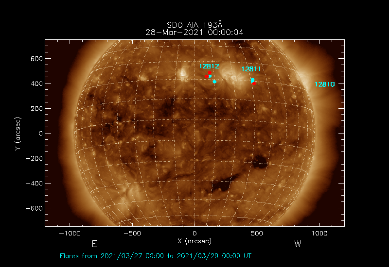 Flares for the 48 hours leading up to the time are over-plotted; these are rotated to the time of the FITS image.