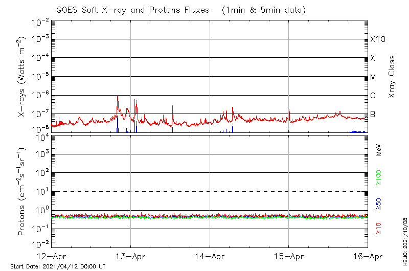 This page provides light-curves generated from GOES soft X-ray and Particle data for the date indicated at the top and the preceding three days.