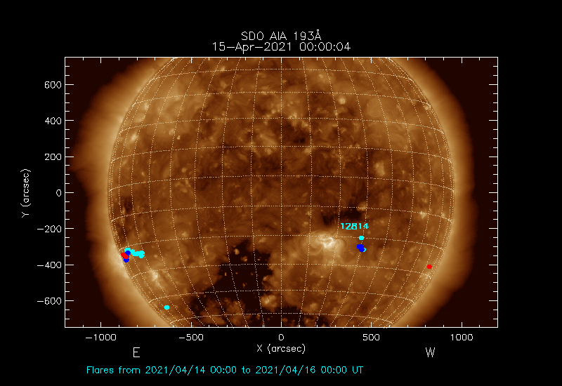 Flares for the 48 hours leading up to the time are over-plotted; these are rotated to the time of the FITS image.