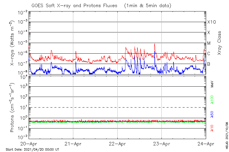This page provides light-curves generated from GOES soft X-ray and Particle data for the date indicated at the top and the preceding three days.