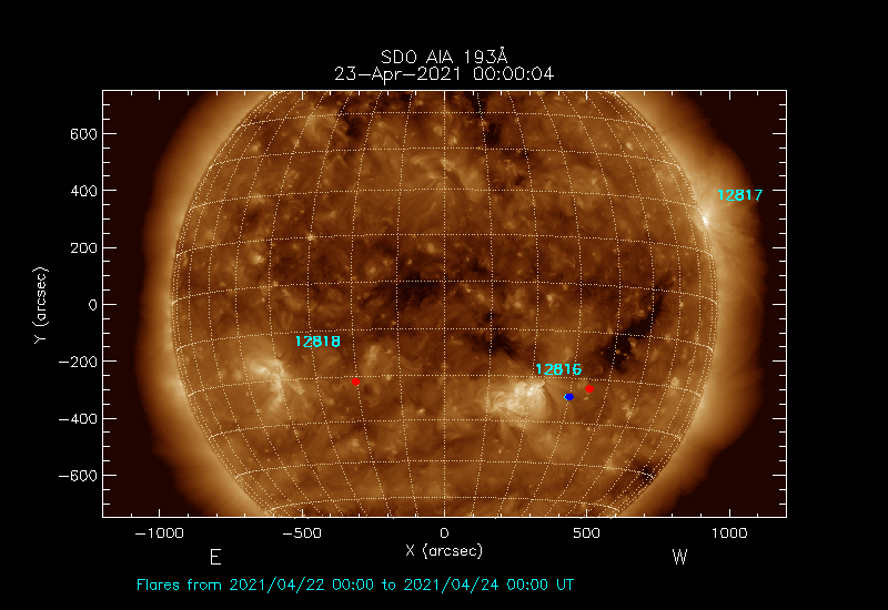 The most recent flares (≤12 hours) are shown as red dots, 12-24 hours as blue