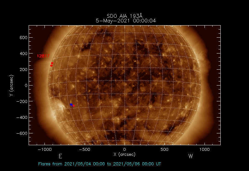 An image is created every 6 hours using the closest available FITS file to this time that can be found. The time interval coverered by the image is indicated in the bottom left hand corner. Flares for the 48 hours leading up to the time are over-plotted; these are rotated to the time of the FITS image.