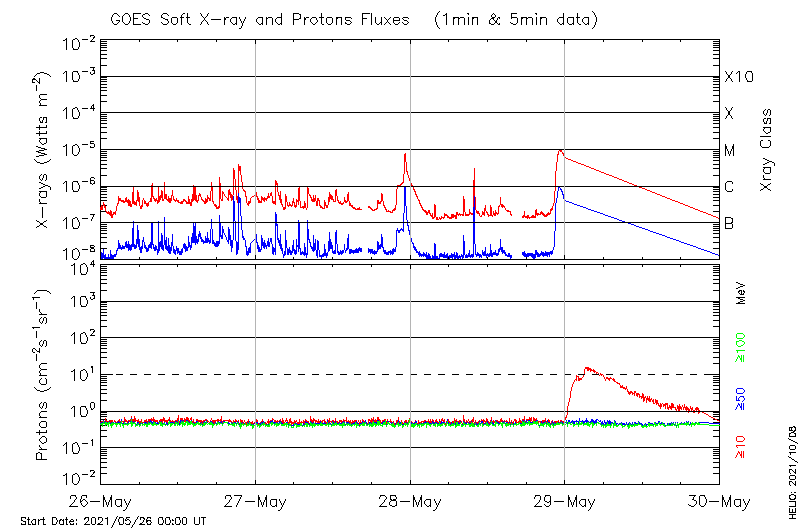 This page provides light-curves generated from GOES soft X-ray and Particle data for the date indicated at the top and the preceding three days.