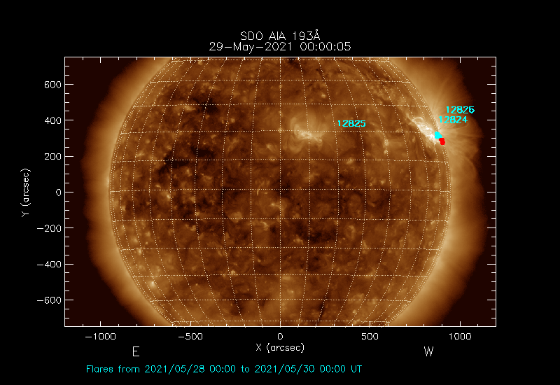 Click on an Active Region plot to display the Region Report including the region evolution and flaring history. HEC Search for NOAA Active Regions (SRS) records for this date and the day before.