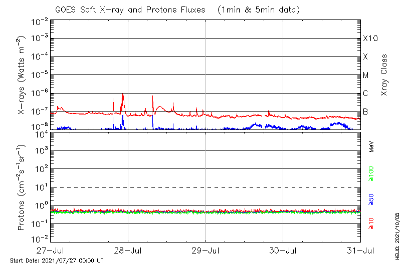 This page provides light-curves generated from GOES soft X-ray and Particle data for the date indicated at the top and the preceding three days.