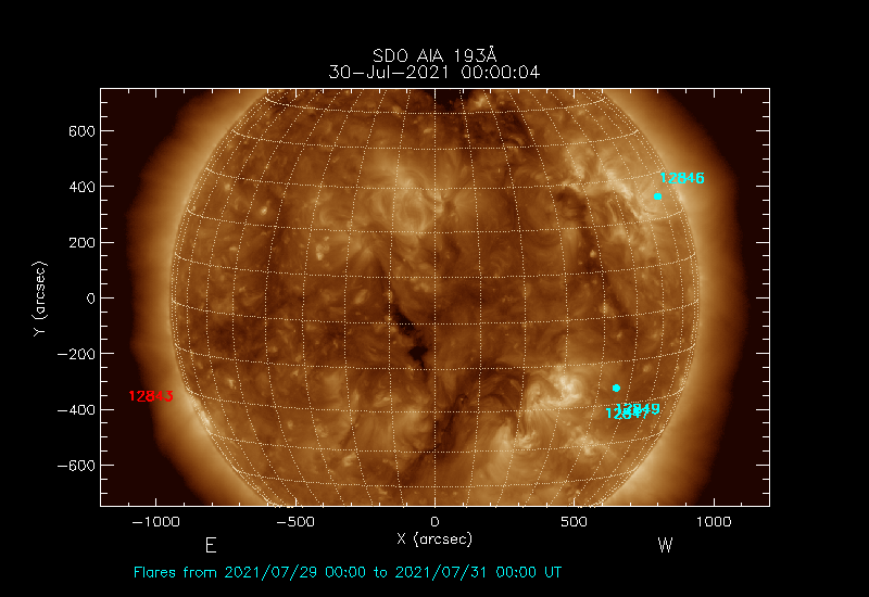 Click on an Active Region plot to display the Region Report including the region evolution and flaring history. HEC Search for NOAA Active Regions (SRS) records for this date and the day before.