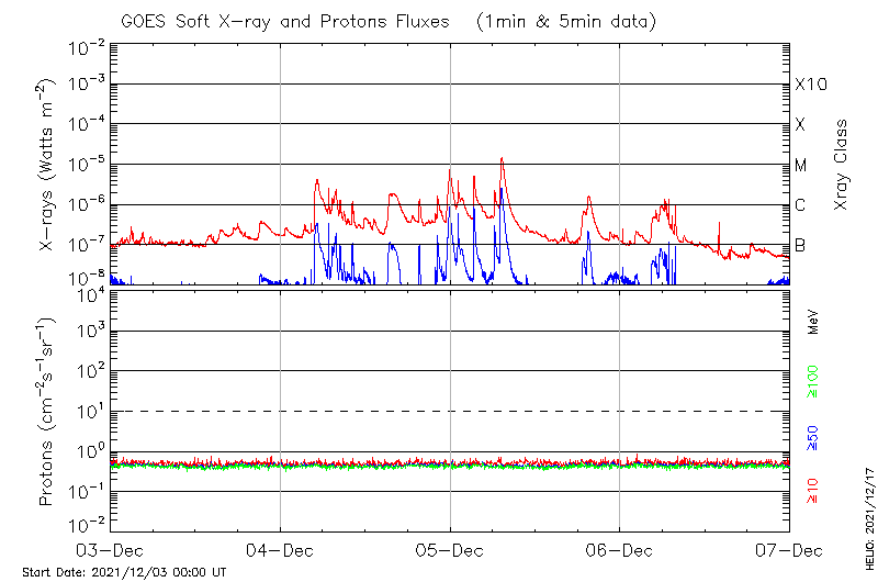 This page provides light-curves generated from GOES soft X-ray and Particle data for the date indicated at the top and the preceding three days.