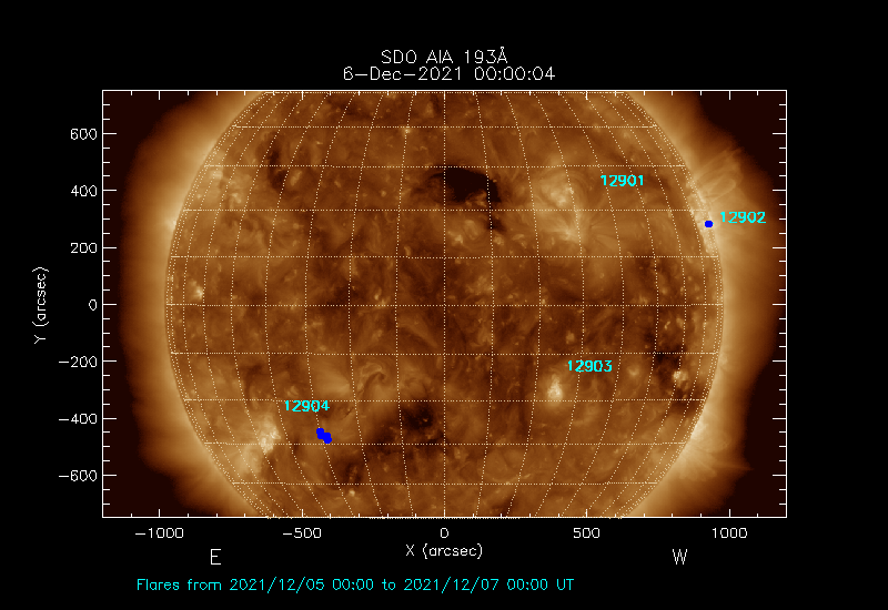 Click on an Active Region plot to display the Region Report including the region evolution and flaring history. HEC Search for NOAA Active Regions (SRS) records for this date and the day before.
