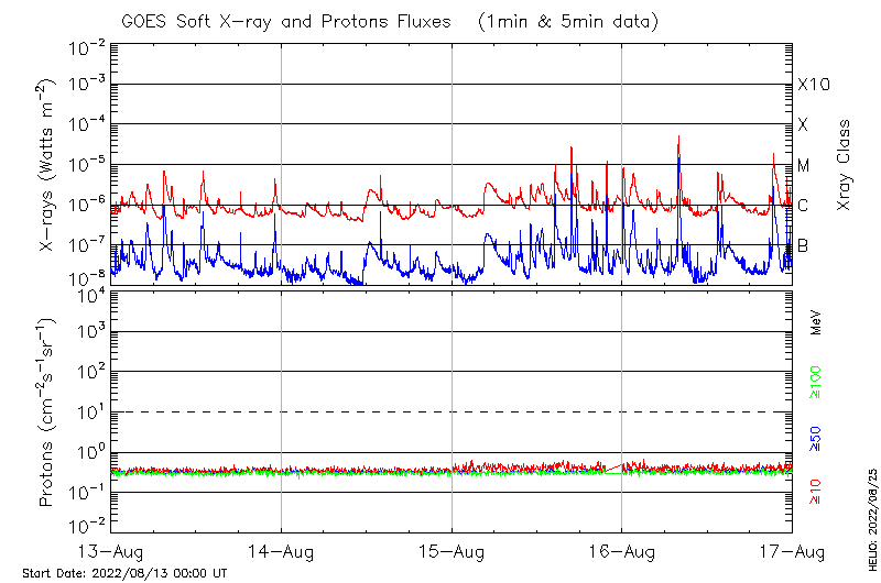 This page provides light-curves generated from GOES soft X-ray and Particle data for the date indicated at the top and the preceding three days.