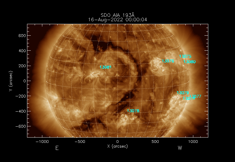 Click on an Active Region plot to display the Region Report including the region evolution and flaring history. HEC Search for NOAA Active Regions (SRS) records for this date and the day before.