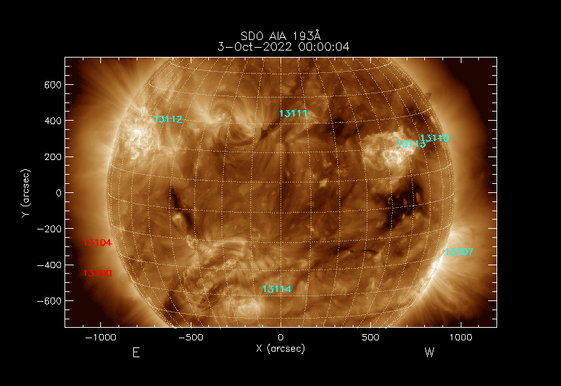 Click on an Active Region plot to display the Region Report including the region evolution and flaring history. HEC Search for NOAA Active Regions (SRS) records for this date and the day before.