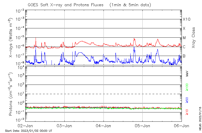 This page provides light-curves generated from GOES soft X-ray and Particle data for the date indicated at the top and the preceding three days.