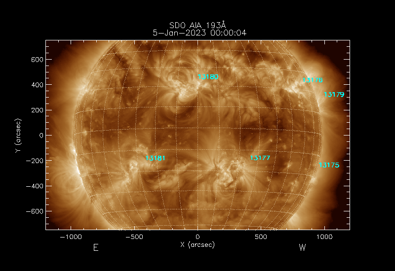 Click on an Active Region plot to display the Region Report including the region evolution and flaring history. HEC Search for NOAA Active Regions (SRS) records for this date and the day before.