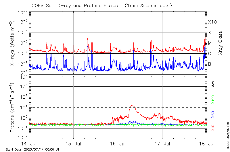 This page provides light-curves generated from GOES soft X-ray and Particle data for the date indicated at the top and the preceding three days.