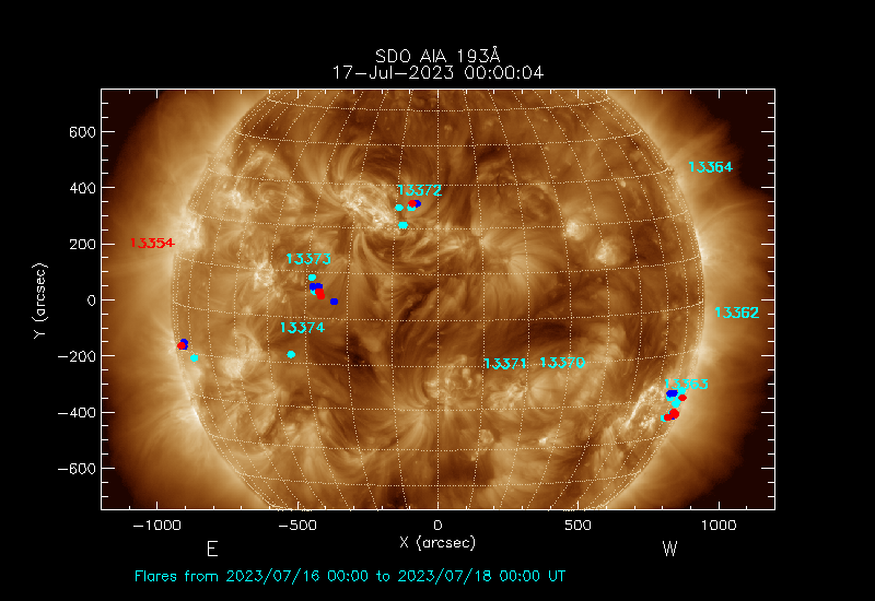 The most recent flares (≤12 hours) are shown as red dots, 12-24 hours ago as blue dots and older ones as turquoise dots.