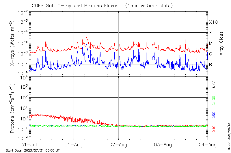 This page provides light-curves generated from GOES soft X-ray and Particle data for the date indicated at the top and the preceding three days.
