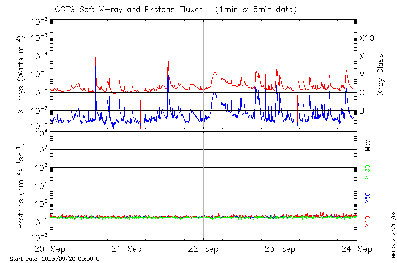 This page provides light-curves generated from GOES soft X-ray and Particle data for the date indicated at the top and the preceding three days.