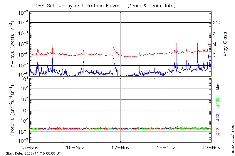 This page provides light-curves generated from GOES soft X-ray and Particle data for the date indicated at the top and the preceding three days.