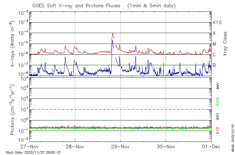 This page provides light-curves generated from GOES soft X-ray and Particle data for the date indicated at the top and the preceding three days.